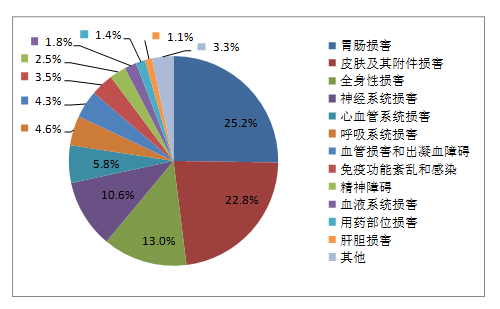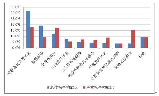 2019年國家基本藥物化學(xué)藥品和生物制品不良反應(yīng)/事件報告,按照藥品類別統(tǒng)計,報告數(shù)量排名前5位的分別是抗微生物藥、心血管系統(tǒng)用藥、抗腫瘤藥、激素及影響內(nèi)分泌藥、治療精神障礙藥;累及器官系統(tǒng)排名前5位的是皮膚及其附件損害、胃腸損害、全身性損害、神經(jīng)系統(tǒng)損害以及血液系統(tǒng)損害。